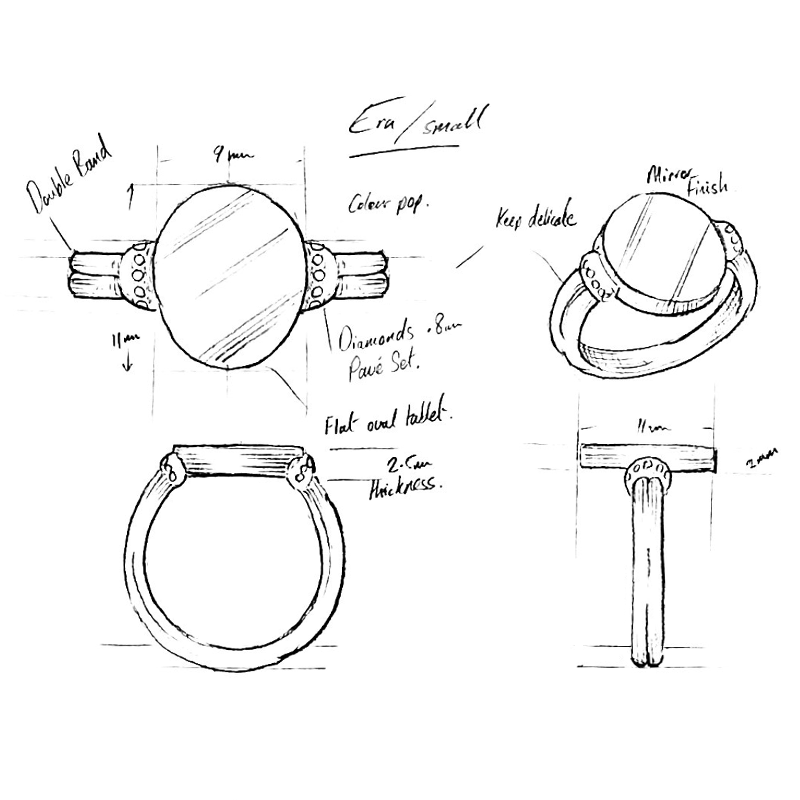 A Rebus favourite, this lovely and delicate signet ring was inspired by the antique Romanesque signet rings in the British Museum. This elegant two banded signet ring is set with five diamonds on each shoulder to add sparkle, and can be made to order in platinum, 9ct, 14ct and 18ct yellow, rose and white gold.